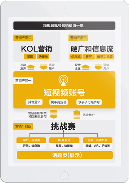 通過其他營銷產(chǎn)品沉淀更多用戶,構(gòu)筑視頻社交資產(chǎn),如企業(yè)號 可以與投放KOL聯(lián)動,通過內(nèi)容、轉(zhuǎn)發(fā)等方式,擴大KOL投放 效果。